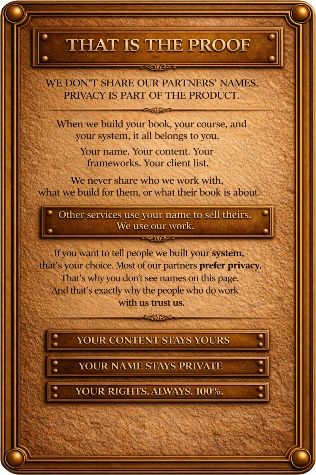 Case studies written from your client outcomes. Data points, before-and-after narratives, and structured evidence embedded in your book, your site, and your course. Not testimonial quotes. Documented proof.