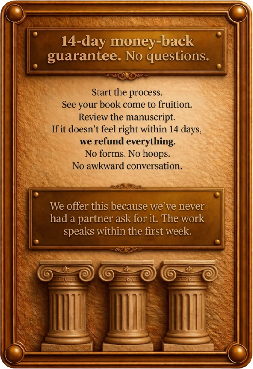 Every book we produce goes through the same 9-stage pipeline I used on my own. Every client owns 100% of the output. I put my name on the process because I stand behind every manuscript that clears our release gate.